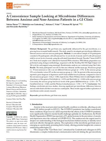 The gut–brain axis, significantly influenced by the gut microbiome, is a growing focus in mental health research. This study aimed to investigate gut microbiome differences between anxious and non-anxious participants. Methods: A convenience sample of 119 participants consisted of 56 participants with self-assessed low to zero levels of anxiety and 63 with self-assessed mild to severe levels of anxiety, using the self-rated Generalized Anxiety Disorder 7-item (GAD-7) test. [...]
