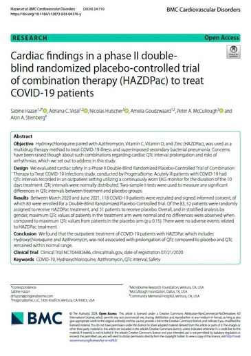 Hydroxychloroquine paired with Azithromycin, Vitamin C, Vitamin D, and Zinc (HAZDPac), was used as a multidrug therapy method to treat COVID-19 illness and superimposed secondary bacterial pneumonia. Concerns have been raised though about such combinations regarding cardiac QTc interval prolongation and risks of arrhythmias, which we set out to address in this study. We evaluated cardiac safety in a Phase II Double-Blind Randomized Placebo-Controlled Trial of Combination Therapy to Treat COVID-19 Infections study, conducted by ProgenaBiome. Acutely ill patients with COVID-19 had QTc intervals recorded in an outpatient setting utilizing a continuously worn EKG monitor for the duration of the 10 days treatment. QTc intervals were normally distributed. [...]