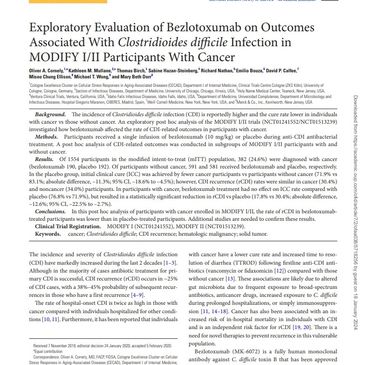 The incidence and severity of Clostridioides difficile infection (CDI) have markedly increased during the last 2 decades [1–3]. Although in the majority of cases antibiotic treatment for primary CDI is successful, CDI recurrence (rCDI) occurs in ~25% of CDI cases, with a 38%–45% probability of subsequent recurrences in those who have a first recurrence [4–9]. The rate of hospital-onset CDI is twice as high in those with cancer compared with individuals hospitalized for other conditions [10, 11]. Furthermore, it has been reported that individuals with cancer have a lower cure rate and increased time to resolution of diarrhea (TTROD) following first line anti-CDI antibiotics (vancomycin or fidaxomicin [12]) compared with those without cancer [13]. [...]
