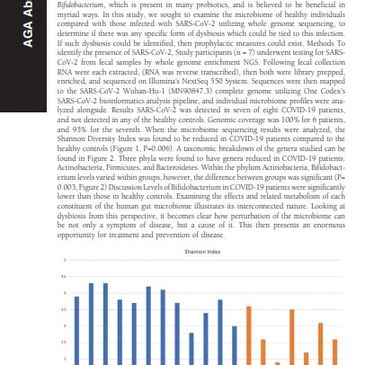 Introduction While COVID-19 has primarily been considered from the perspective of a respiratory illness, and rightly so, the presence of the causative virus, SARS-CoV-2 in the gastrointestinal tract has been demonstrated by many studies utilizing a variety of methodology. This presents another avenue by which to examine the virus. Interactions between the host and the gut microbiome have dramatic impacts on the immune system of the host in several ways. One genus of microbiome bacteria that has demonstrated favorable effects is Bifidobacterium, which is present in many probiotics, and is believed to be beneficial in myriad ways. In this study, we sought to examine the microbiome of healthy individuals compared with those infected with SARS-CoV-2 utilizing whole genome sequencing, to determine if there was any specific form of dysbiosis which could be tied to this infection. [...]
