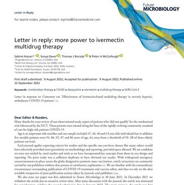 Many thanks for your review of our observational study report of patients who 'did not qualify' for the randomized trial referenced by the NCT. These patients were treated along the lines of the rapidly evolving community standard of care for high-risk patients COVID-19. Age is an important risk-stratifier and our sample included 47, 46, 46 and 43 year olds individuals but in addition five notable patients were 94, 86, 92, 87 years of age, far away from a threshold of 50. All of these elderly patients survived. [...]