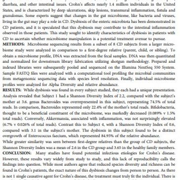 Crohn's Disease (CD) is a debilitating chronic inflammatory process of the gastrointestinal tract which primarily affects children, teens, and young adults, causing severe pain, diarrhea, and other intestinal issues. Crohn's affects nearly 1.4 million individuals in the United States, and is characterized by deep ulcerations, skip lesions, transmural inflammation, fistula and granulomas. Some experts suggest that changes in the gut microbiome, like bacteria and viruses, living in the gut may play a role in CD. Dysbiosis of the enteric microbiota has been demonstrated in CD patients, and it is speculated that this dysbiosis may contribute to the intestinal inflammation observed in those patients. This study sought to identify characteristics of dysbiosis in patients with CD to ascertain whether microbiome manipulation is a potential treatment avenue to pursue. [...]
