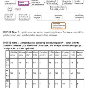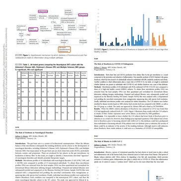 The gut brain axis is a system of bi-directional communication. When the delicate balance of the microbiome is disrupted, the resulting dysbiosis can be a factor in the development of neurological disorders, including Alzheimer’s Disease (AD), Parkinson’s Disease (PK), and Multiple Sclerosis (MS). One major player in the gut brain axis are short-chain fatty acids (SCFA), particularly butyrate, acetate, and propionate. These are produced by key players in the gut microbiome via breakdown of dietary fiber. In this study, we sought to identify a characteristic microbial “signature” of neurological disorders and identify potential therapeutic targets. [...]