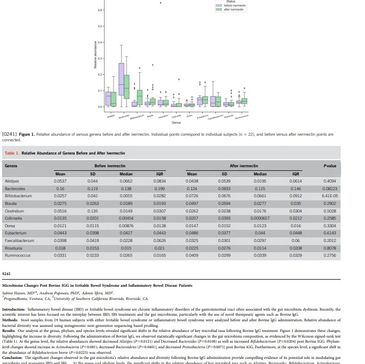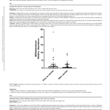 Messenger RNA vaccines for preventing SARS-CoV-2 infection are widely used yet their effect on the gut microbiome is not known. Low bifidobacteria levels have been linked with severe SARS-CoV-2 infection, inflammatory bowel disease, Clostridioides diffıcile infection, obesity and aging. Preliminary case reports suggest fecal microbiota transplant could cure SARS-CoV-2 infection (1). A study by Bozkurt et al. showed that SARS-CoV-2 patients taking bifidiobacteria-containing probiotics had lower COVID-related hospitalization times (2). Methods: 34 subjects had stool collection prior to vaccination and one month post vaccination to evaluate the relative abundance of bifidobacteria in the gut. DNA was extracted, library was prepped, and enrichment and sequencing were done using metagenomic next generation sequencing. Results: Relative abundance of genus bifidobacteria significantly decreased to about half of original value after vaccination (P 5 0.0065 via Wilcoxon signed rank test). Prior to vaccination, median (interquartile range) values of relative abundance for genus bifidobacteria were 1.13% (0.0016% to 2.52%) and after vaccination were 0.64% (0.0015% to 2.48%). [...]