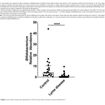 Lyme disease is a poorly understood condition which starts with a rash but may continue with chronic fatigue and neurological symptoms. Approximately 1 in 5 early Lyme disease patients have GI symptoms, such as nausea, anorexia, abdominal pain, or diarrhea. Lyme disease is thought to be cased by microbes in the spirochetes phylum transmitted by black legged ticks. Lyme-related healthcare costs in America exceed 1.3 billion dollars annually. Bifidobacteria are known for their beneficial probiotic actions within the human gut microbiome. Their numbers are reduced in severe COVID-19, Clostridioides difficile infection and Inflammatory Bowel Disease. To our knowledge Bifidobacteria levels have not been studied in Lyme disease patients. Given the importance of Bifidobacterium abundance in other diseases, we focused on relative abundance of Bifidobacterium in fecal samples of patients with Lyme disease compared to controls. [...]