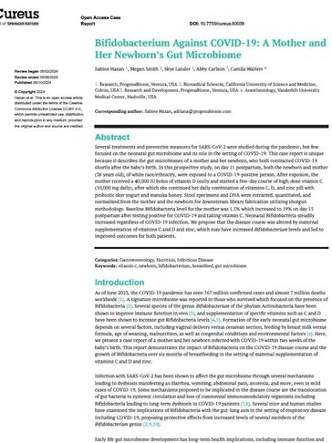 Several treatments and preventive measures for SARS-CoV-2 were studied during the pandemic, but few focused on the neonatal gut microbiome and its role in the setting of COVID-19. This case report is unique because it describes the gut microbiomes of a mother and her newborn, who both contracted COVID-19 shortly after the baby’s birth. In this prospective study, on day 11 postpartum, both the newborn and mother (38 years old), of white race/ethnicity, were exposed to a COVID-19-positive person. n. After exposure, the mother received a 40,000 IU bolus of vitamin D orally and started a five-day course of high-dose vitamin C (10,000 mg daily), after which she continued her daily combination of vitamins C, D, and zinc pill with probiotic skyr yogurt and manuka honey. [...]