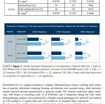 Eosinophilic gastritis (EG) and/or duodenitis (EoD) are characterized by chronic gastrointestinal symptoms and accumulation and activation of eosinophils and mast cells in the stomach and/or duodenum. Lirentelimab (AK002), an antibody against siglec-8, depletes eosinophils and inhibits mast cells. In a 16-week randomized, double-blind phase 2 study of patients with moderate–severe EG and/or EoD (ENIGMA), lirentelimab significantly reduced gastrointestinal eosinophils and patient-reported total symptom scores (TSS) compared with placebo. To evaluate the long-term safety and efficacy of lirentelimab, we conducted an open-label extension (OLE) study, and present data by disease type (EG6EoD vs EoD without EG) through week 94. [...]
